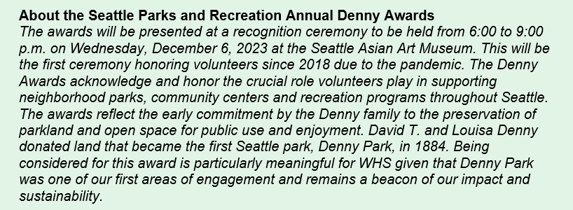 Community support is essential to our mission and movement. Please support us by taking a moment now to nominate We Heart Seattle for the Seattle Parks and Recreation annual Denny Awards — which, in the words of AP Diaz, Superintendent of Seattle Parks and Recreation — “shine light once again on the amazing contributions of our park volunteers.” That sounds like us! Nominations are due by October 20. More information HERE and the nomination form is HERE.