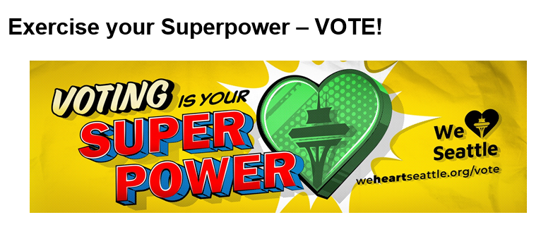 Typically, less than 50% of eligible voters cast their ballots in Seattle for local elections. Those who do vote decide the fate of our community for years to come. We summon you to exercise your civic superpower to VOTE! This is a consequential election for the city in which council positions from all seven districts are on the ballot as well as several King County Council seats. Use your superpower to elect compassionate and sensible leaders. Ballots will be mailed out on Oct 18th.