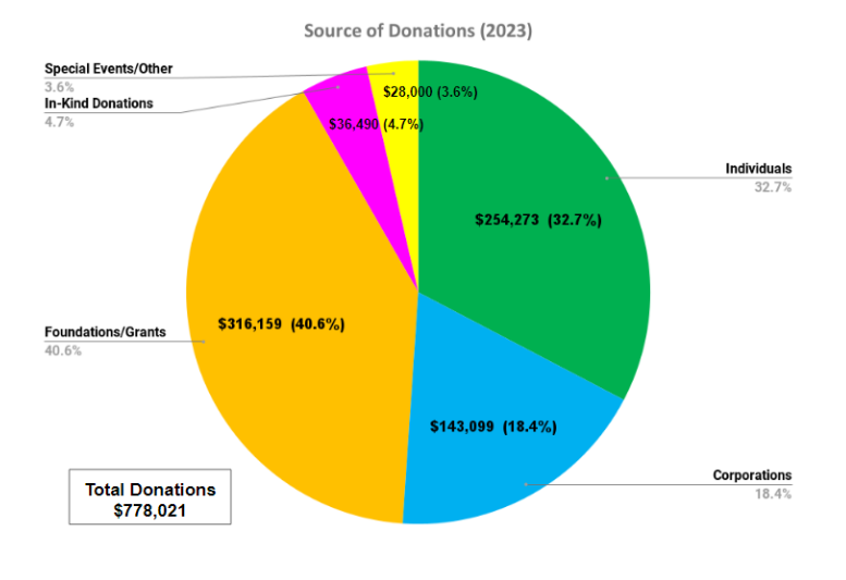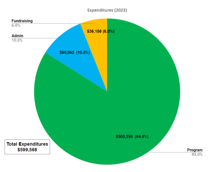 We have closed our 2023 financial books and are happy to share where we landed in terms of donations and expenditures. As you can see, our grassroots effort continues with a significant amount of our funding coming from individual contributions.