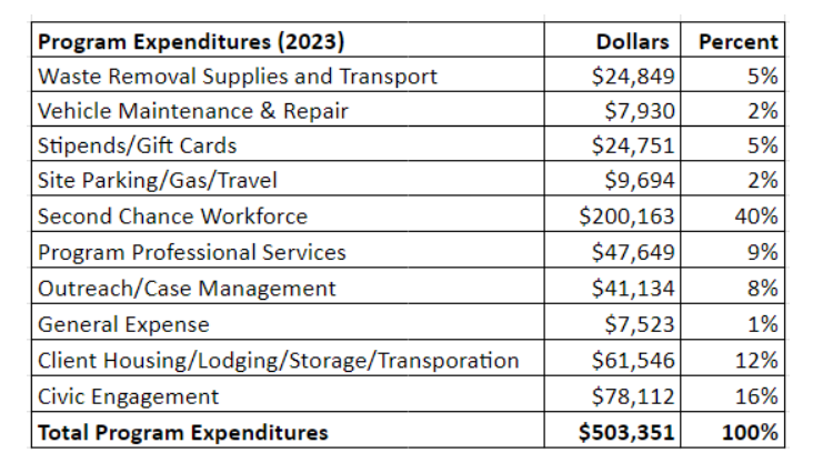 Our small and nimble team of staff and volunteers regularly connect the unhoused folks they meet on litter picks to a range of vital resources, including shelter, housing, employment, recovery/treatment navigation, securing vital documents, and removing a range of other barriers. Several on our team have lived experience, which is key to building trust and maintaining motivation for change. To date, WHS has assisted 144 people in moving off the streets.