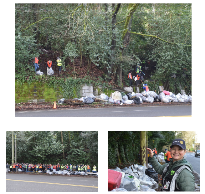 This record-breaking month included our routine litter picks throughout the city along with two large community-wide events – one in West Seattle where we partnered with A Cleaner Alki and one off of Dexter Avenue North close to the Fremont Bridge where we partnered with Rotary District 5030. The collaborative litter pick with the Rotarians was particularly challenging given the steep muddy slopes (which the city avoids) and layers upon layers of years-old embedded debris. Ultimately, about 55 volunteers hauled out approximately 10,000 pounds of garbage, with dedicated smaller WHS teams set to return for final clearing.